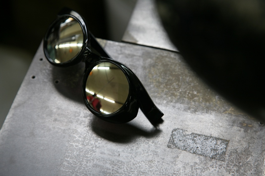 三角に対して丸なのが381。こちらはできる限り薄い生地を使用した“フード一体型ゴーグル”がイメージにあり、書き上げたもの。380と同様、かけると表情の変化の振り幅が大きい。ミラーレンズにし、より未来感を演出。