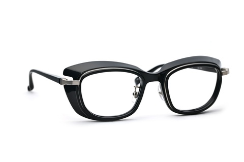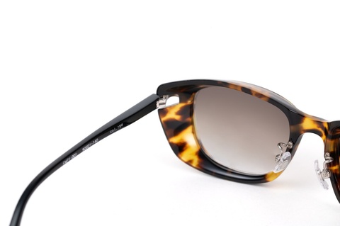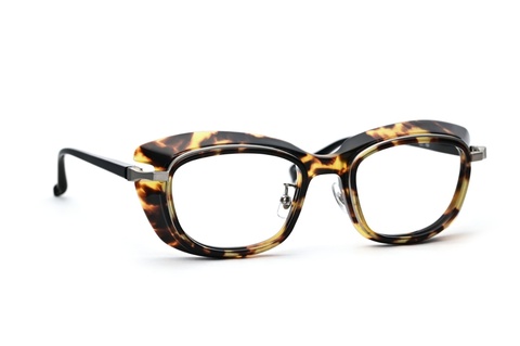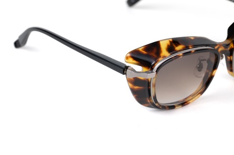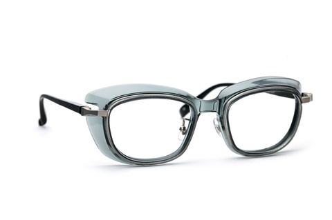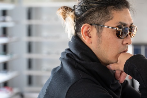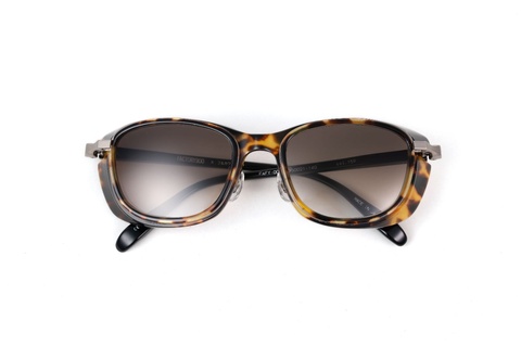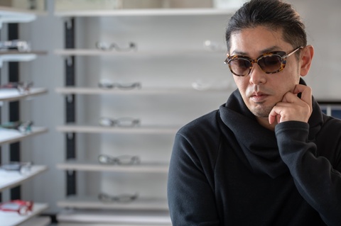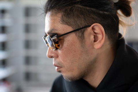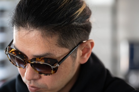 「FA-361」と同じように、フード状のフロントにメタルパーツを組み合わせコンビネーションフレームの「FAFY-001」を、フルカワさんは基本メガネとしてご活用いただいておりますが、レンズの縦幅が37.5mmということもあり、写真のようにグラデーションのカラーレンズを組み合わせることでサングラスとしてのご活用もアリだと思います。