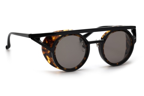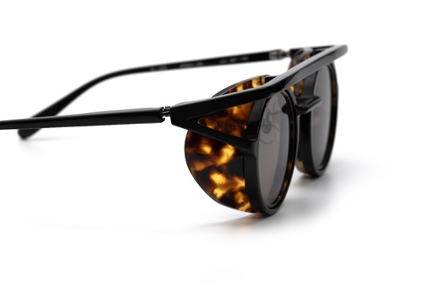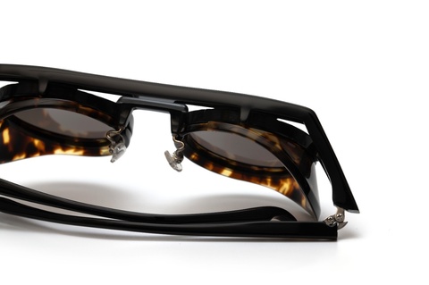 A写では伝わりにくいかと思いますが、フード状のリムとフロントパーツを組み合わせたコンビネーションフレームです。ある意味FACTORY900が得意とするアセテート同士の組み合わせによって、スチームパンクを思わせるフューチャリステックな仕上がりです。