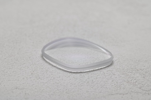 写真は左レンズになりますが、実際に加工機で削り上がった状態でリムの厚みとほぼ同様の4mm、ご覧のようにリムのなかにレンズの厚みがしっかりと収まりました。