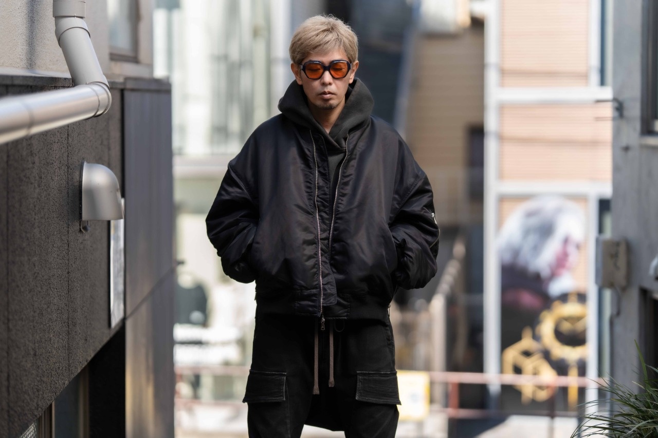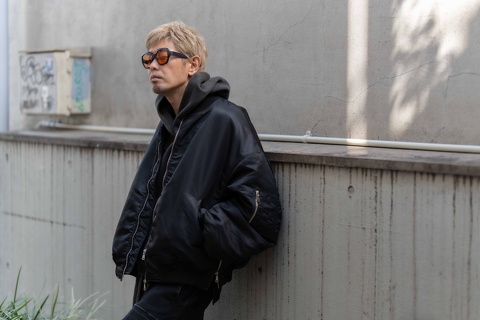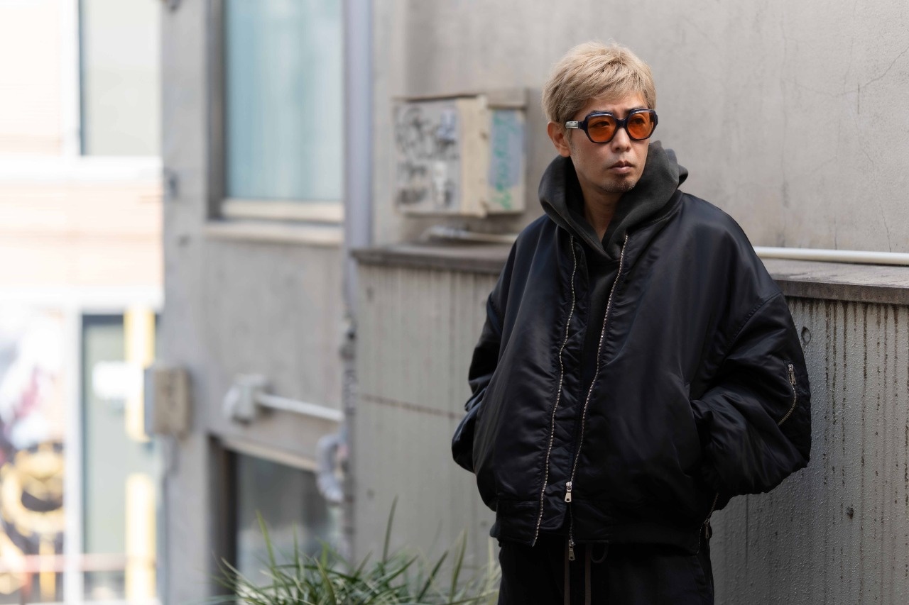 商品詳細でも触れたように、「FA-441」の別注色と同じ「col.499」のネイビーにレンズ濃度35%のオレンジを組み合わせ、変則的なビッグシェイプがどこかサイバー感も漂わせます。とはいえ、ちまたで”Y3K”と呼ばれる近未来を感じさせるスタイルとは異なり、むしろレトロとフューチャーの融合といった表現の方が正しいかもしれません。
