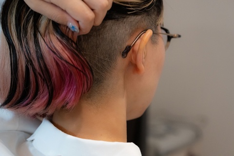 「RF-058」にはZEISSの調光レンズ”PhotoFusion” パイオニア(グリーン)を組み合わせていた松本ですが、「Hachi」に関しては、そのサイズ感を考慮し、アリアーテトレス TRVI(トゥルーバイオレット)15%グラデーションカラーを組み合わせました。