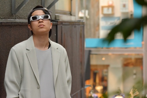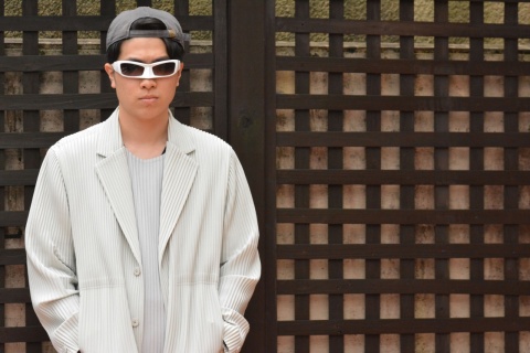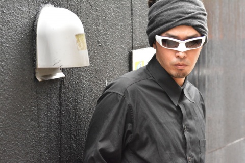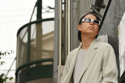 イッセイミヤケのジャケットに、キャップを合わせることでこなれ感を演出しつつ、サングラスにMASKを使用することで一気にアバンギャルドなスタイルへ。