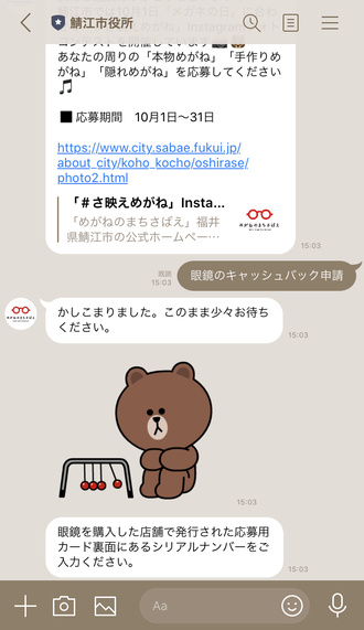 商品をご購入後、応募用カードに記載されているQRコードから「鯖江市役所」LINE公式アカウントを友だちに追加して応募がスタートします。