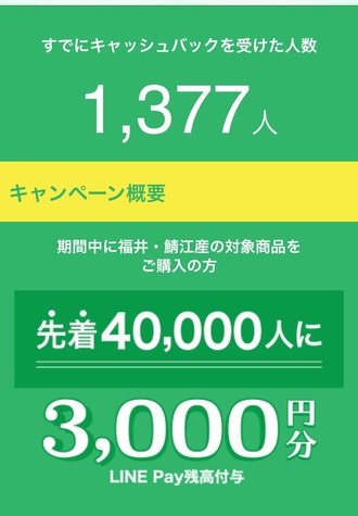 10月1日からスタートした本キャンペーンは、全国約3,000店舗を対象(オンライン店舗は対象外)として、LINE Payを活用してキャッシュバックいたします。キャンペーン期間中に福井・鯖江産の対象商品を購入し、「鯖江市」の公式LINEアカウントの友だち登録をした方のうち、先着40,000人に3,000円、さらに先着15万人から抽選で100人に1人に20,000円をキャッシュバック!