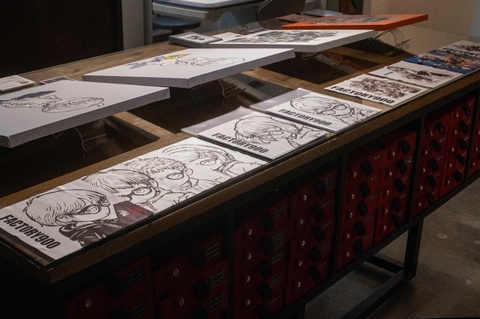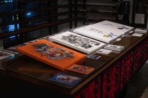 現在、TOKYO BASEでは、センターテーブルに、前田さん、ヒデオスさんの作品を展示させていただいたおります。また、今回両クリエイターのお2人にデザインしていただいたガチャガチャ用のセリート(メガネ拭き)も展示しております。