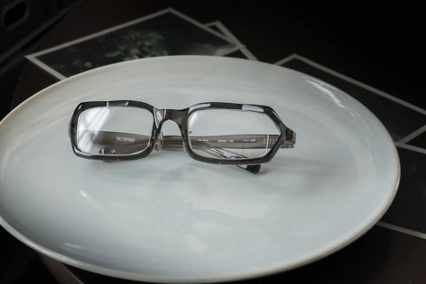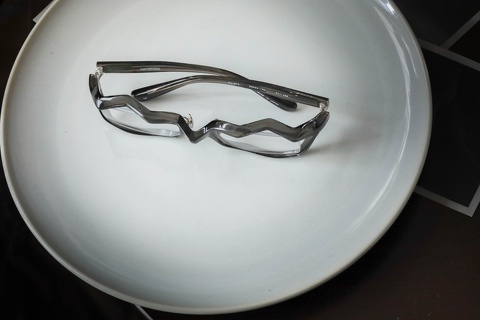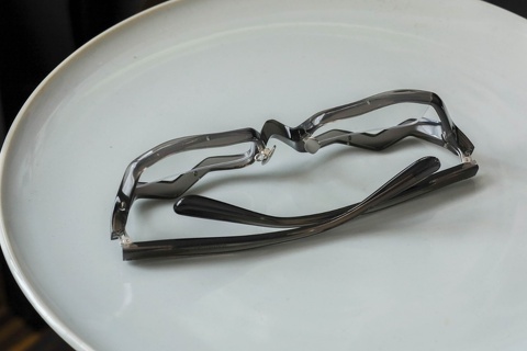 正面から見ると、一見シンプルなスクエア型と思わせておいての変化球。フロントリムの形状が特殊なモデルです。ジャバラのようなカタチであり、プラスチック製のデザインではなかなか見られない形かと思われます。しかも上下で形状が違っており、下のリム部分は少しなだらかなため、頬に当たりにくくしている設計に。青山眼鏡ならではの唯一無二なデザインです。