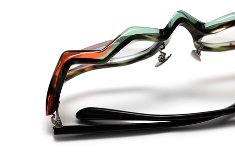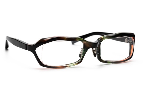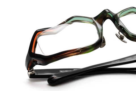 このように角度を変えてご覧いただくと、ブリッジの周辺に見えるグリーンから、智元に向かってオレンジに変化していくのがお分かりいただけます。また、テンプルは通常の”黒”になりますが、レーザーで刻印された”九百大阪”の文字がハッキリとご覧いただけます。