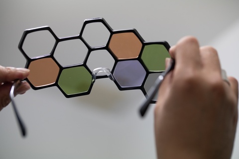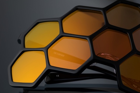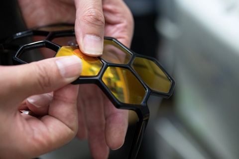 全て六角形のシェイプになっていますが、中心の2カ所は他の箇所よりもサイズが小さく、レンズを入れる際はより慎重になります(汗)「RF-087」に関してもレンズのサイズが3種類(大・中・小)ありますが、1番小さいレンズのサイズ感を見極めるのが難しく、加工時に1番緊張感が高まる瞬間です。