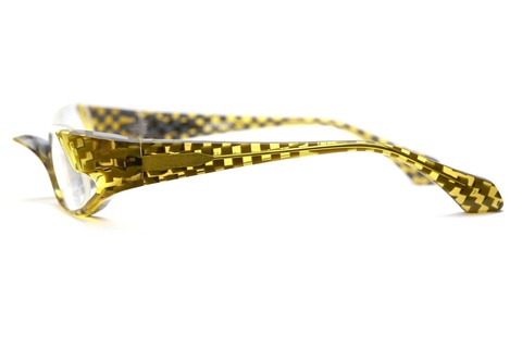 「FA-301」や「FA-241」のニューカラーバリエーションに使われたcol.377(紫/市松柄)同様、裏側に市松柄を合わせたカラーです。col.377は裏面の市松柄がお顔の角度によって見え隠れしますが、このcol.612(黄/市松柄)は前面の黄色が透けるので、正面からも市松柄が楽しめるカラーです。掛けこなすには、ファッションとの組み合わせをよく考えないといけませんが、掛けこなしたら自身のトレードマークにもなりうる存在になってくれるはずです。