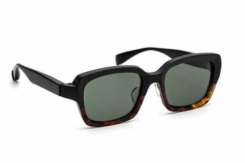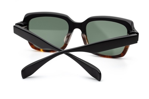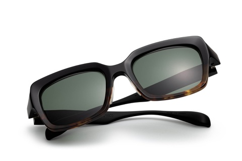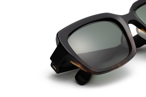 スクエア型のビッグシェイプをベースにフロントの全面にテレビジョンカットを施し、ほど良いアクセントを印象付けるとともに、使い勝手の良さを両立させたサングラスデザインになります。一見、シンプルで平面的なデザインに見えますが、テレビジョンカット面のみに艶を残したマット加工によって、見る角度によってコントラストともに立体造形が浮かび上がります。
