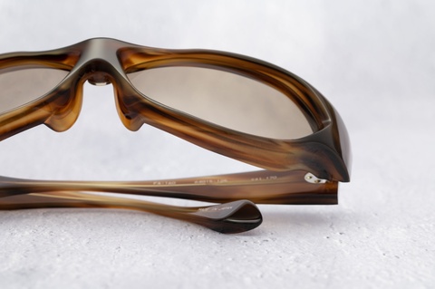 吊り上がったフロントシェイプも「FA-160」の大きな特徴といえますが、もともとサングラスデザインということもあり、レンズカーブも6カーブ設定となっており、お顔を包み込むようにフィットします。特に「col.170」は肌色に近いブラウン系ということで、カラーバリエーションのなかで最も馴染みやすく、見た目の厳つさを和らげる効果が期待できます。