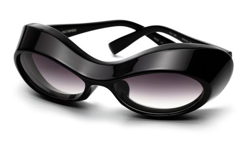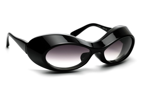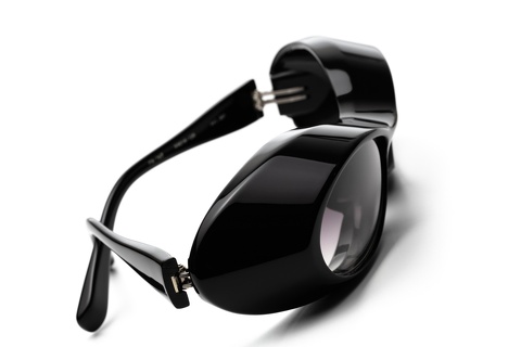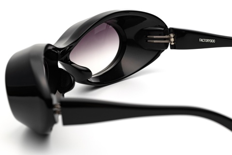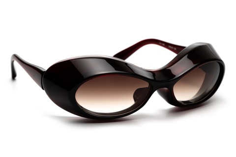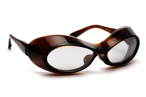 目を覆うようにデザインされたフード状のフロントはもちろんアセテート素材を用い、見た目の通り重厚感のある仕上がりです。肉厚なフロント面には面カットを施し、いわゆる”インジェクション”と呼ばれる成型法でカタチになったプロダクトとは異なり、最終的には熟練の職人が磨き上げることでアセテートに映り込む光の反射から、その美しい面造形によって成り立っていることがお分かりいただけると思います。