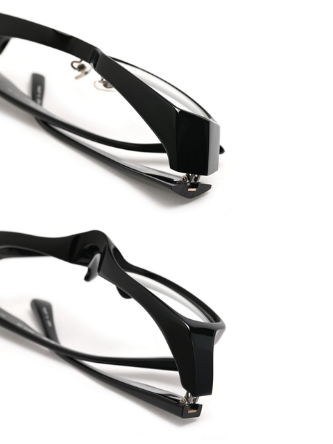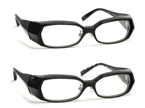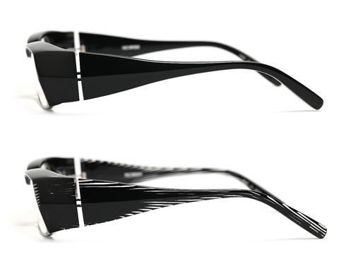 このように斜めからご覧いただくとテンプルにうっすらとボーダー柄が確認できます。光の当たり方、また見る角度によって若干変化があるかと思いますが、「col.001」に比べ若干見た目の強さが和らいだように感じます。