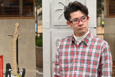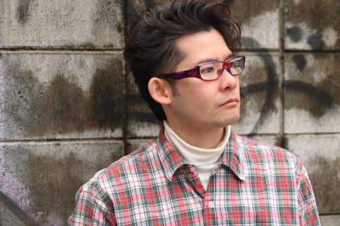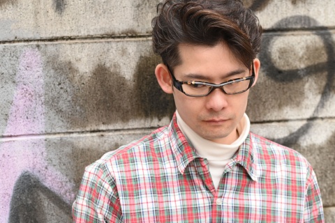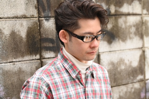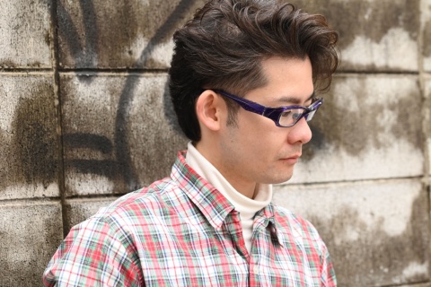 一見、黒のようにも見えますが部分的に見える濃茶柄によって、佐藤の顔色も若干明るく感じます。さらに「FA-231」のキレのあるフォルムがメリハリを生み、引き締まった表情を作り出しました。