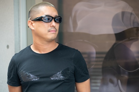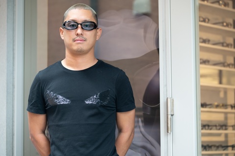 普段はほとんどメガネは掛けないという関口さんですが、FACTORY900を代表する「FA-240」に濃度44%のブルーのカラーレンズを組み合わせ、タウンユースでご使用いただけるサングラスとしてご活用いただきます。