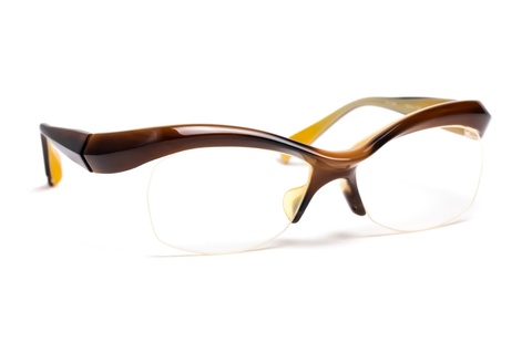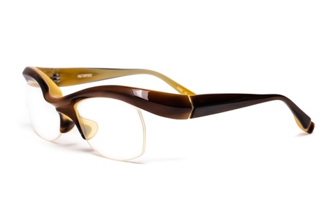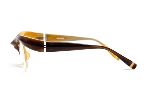当時FACTORY900のブローフレームといえば、ソリッドなカラーをイメージされていた皆さんも多いかと思います。そんななか、「FA-248」のサンプルを見て、この「col.209」(ブラウン/イエロー)をはじめとした新色が非常に新鮮に感じたことを今も覚えています。ブローフレーム=ビジネスマン、ビジネスマン=シックなカラーという、凝り固まった固定概念を覆す、ポップなカラーの登場に個人的にも目の覚めた瞬間です。