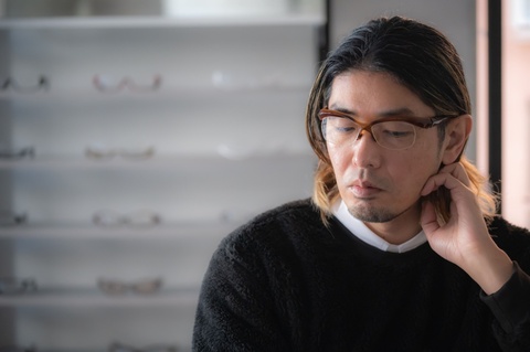 実際に掛けてみると、背面に見える明るいイエローはむしろ肌色に馴染み落ち着いた印象に。「FA-240番台」らしいソリッドな造形と力強いブローラインが特徴の「FA-248」ですが、どこか温かみを感じる色使いといえます。