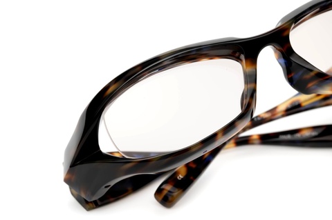 そんなソリッドな「FA-240」にバラフの色合いが広がります。肉厚なフロントは深みのある落ち着いた色合いですが、よくよくご覧いただけると細部には、ところどころ紫の柄が見え隠れします。クラシックフレームではお馴染みの、いわゆる”べっ甲柄”にはない色合いであり、フロントよりもテンプルの方が柄の雰囲気はより分かりやすいかと思います。