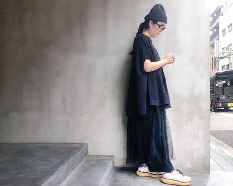ラインがゆったりしながらも、少しデザインが変わっているスポーティなTシャツに、シンプルなスウェットパンツ。それだけでももちろんいいのだけれど、チュールワンピースがいい意味でも違和感をもたらすことで、自分らしさが(この場合、私らしさ)が表現できます。