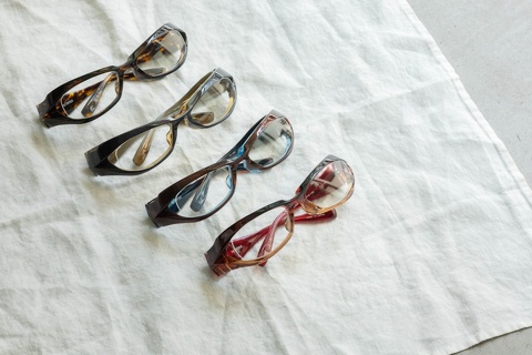 スタイルの印象を明確に決めたい時、このようなキレのあるソリッドな造形に赤のグラデーションの眼鏡をかけると、着慣れた装いの空気ががらりと変わります。まさに主役級の色あいですが、やはり4色ともに全体を通して言えることですが、大人っぽさが垣間見えるカラーリングのため、カジュアルな装いでもドレスアップしてくれます。
