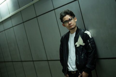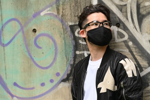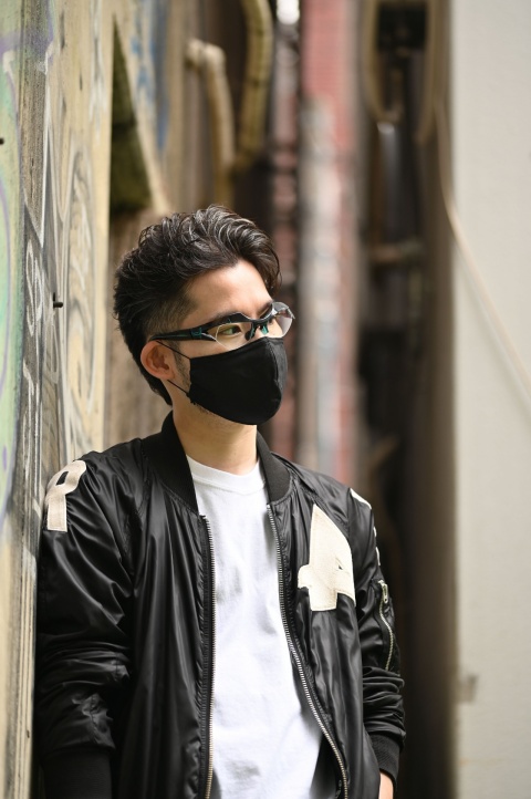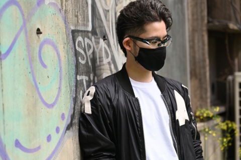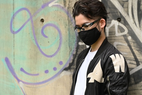 圧倒的な存在感を放つ「FA-370」とバランスと保つため、今回は佐藤にもあえて黒のマスクをつけてもらいました。