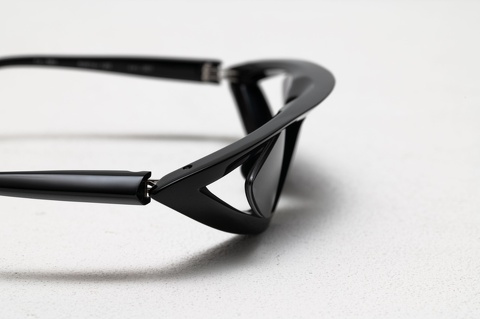 レンズの天地幅も極端に狭く、非常にシャープなデザインに見えますが、サイド、もしくは斜めと角度を変えてご覧いただくと、FACTORY900ならではの立体造形とともに、フロントの美しい曲線が姿を現します。