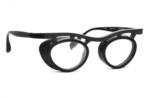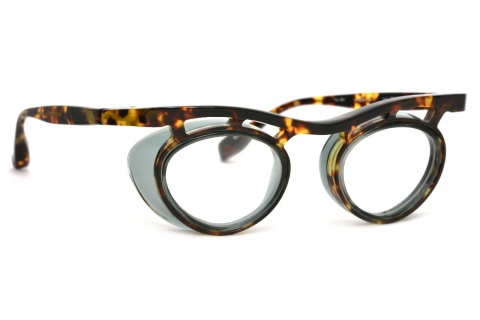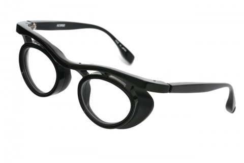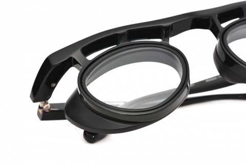 アートの領域に踏込みつつも、どこか工業的な雰囲気を醸し出す近未来的なゴーグルタイプ、まさにブランドのコンセプトである「THE FUTURES EYEWEAR」をより濃密に体現できるモデルといえるのではないでしょうか。