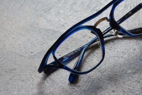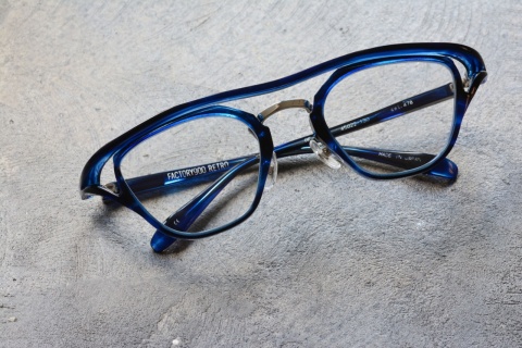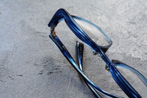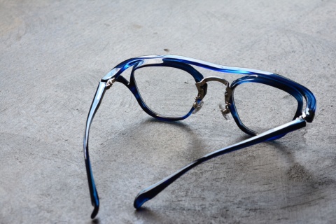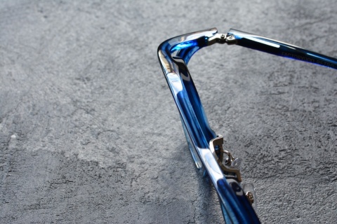 全4色のカラーバリエーションのなかで、1番鮮やかな色合いがであり、一般的なクラシックフレームでは用いることの少ないブルーですが、やはり実際に掛けているところを見ないと伝わりませんね。