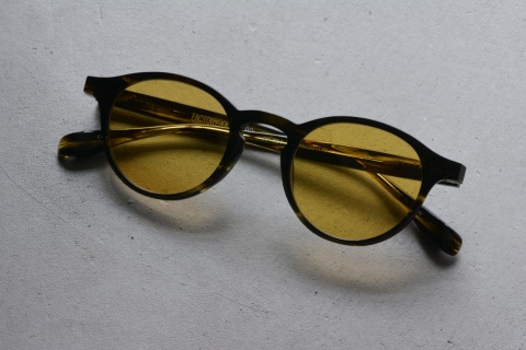 col.566(グリーンササ)の落ち着いたフレームカラーにはイエローのレンズを入れ、ギャップを感じる仕上がりに。