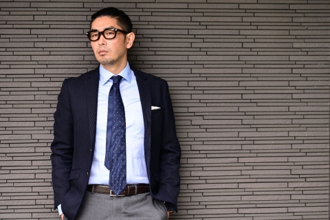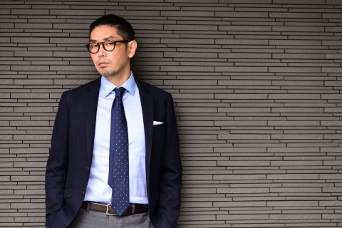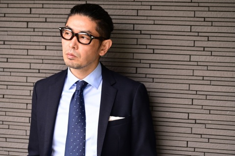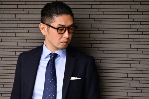 ”クラシコ”と呼ばれるスタイル合わせ、ネイビーのジャケット、淡いブルーのシャツ、そしてネクタイと王道ともいえる組みわせに合わせるのはビール茶です。