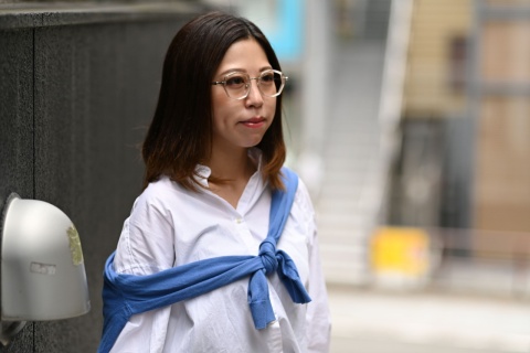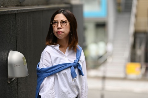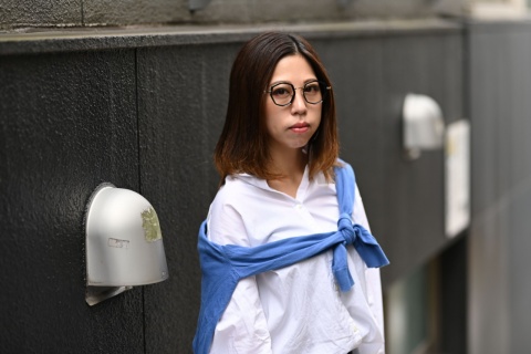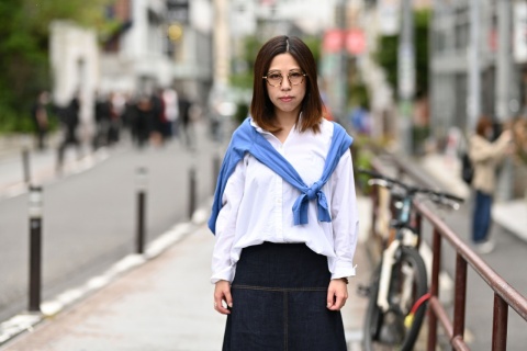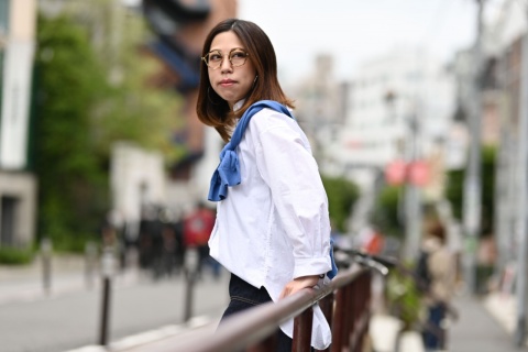 お洋服は同じでもメガネが変わるだけでグッとイメージが変わる、お手本のようなスタイルサンプルです。