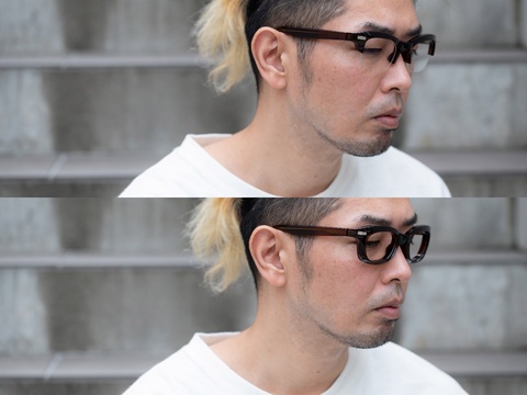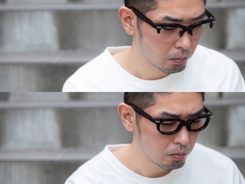 ソリッドでどっしりとした「RF-041」のような無骨なスタイルは、お顔立ちだけではなく、その人の雰囲気によっても似合う似合わないが左右されます。髭や髪型はもちろん、これからの季節であれば身に着ける小物なども駆使しメガネのボリュームに負けないよう一工夫をしたいところです。