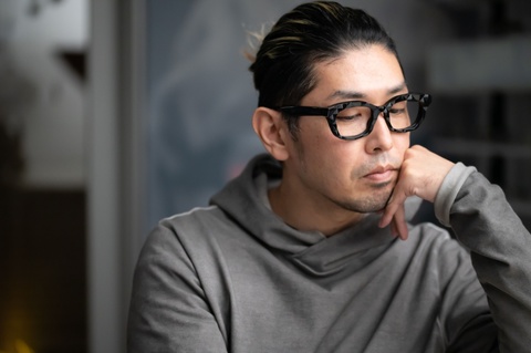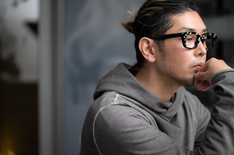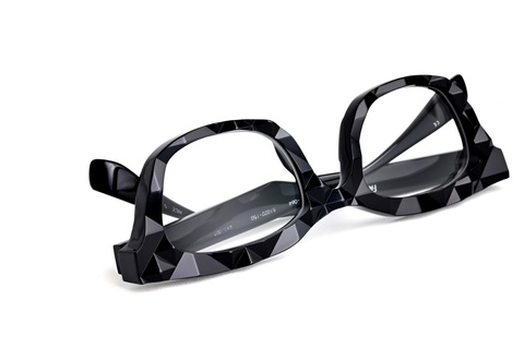 ご覧のように、玉型自体は決して奇抜なカタチではなく、むしろオーソドックスな黒縁メガネかと思いきや、若干お顔の角度を変えた瞬間に、光の反射によってランダムに配置させた大小のダイヤモンドカットが姿を現します。