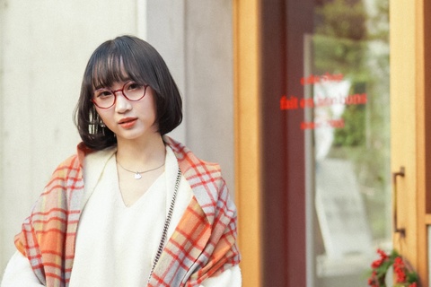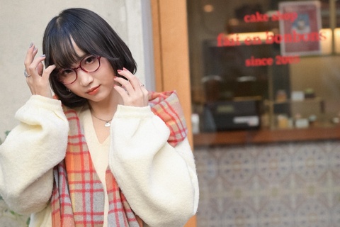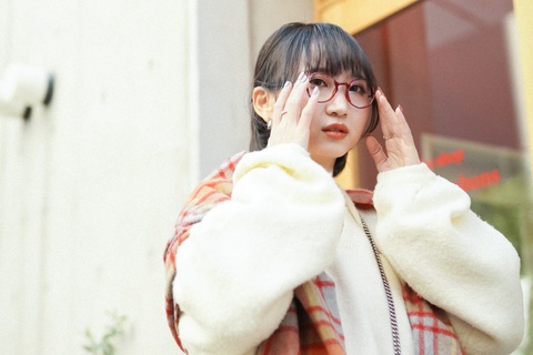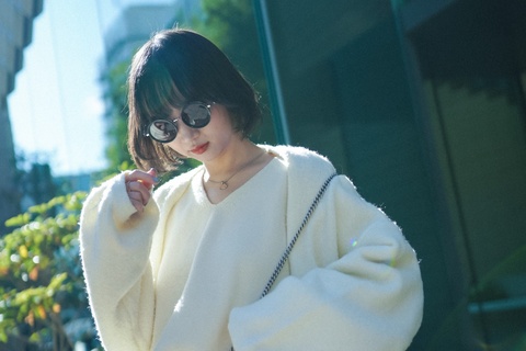 今回かけていただいたモデルさんは非常に小顔の方で、その上、オン眉ボブヘアーの小顔効果のあるヘアースタイル。RF-306のサイズ感はぴったりにハマっていますね。八角形はラウンドよりも目元がすっきりと見えるのでキメ過ぎず、崩し過ぎずに抜け感を出せています。