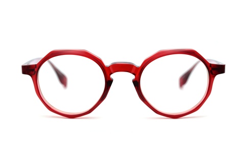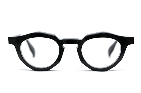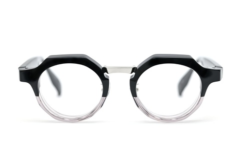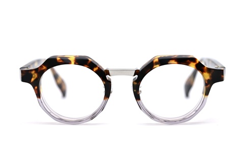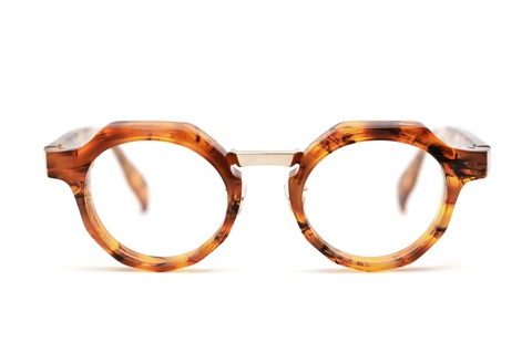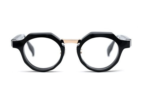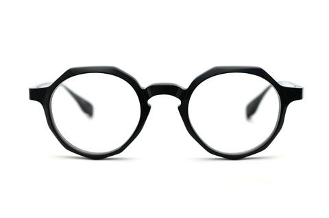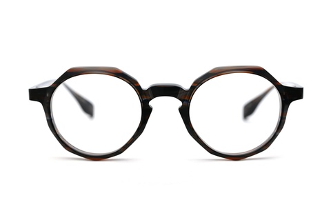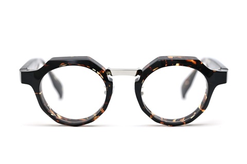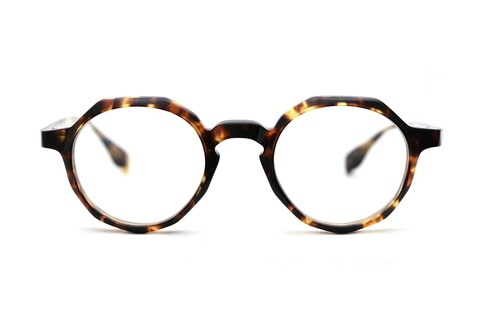 レンズは丸みを帯びたボストン型の玉型に対し、フレームの形はカット面を多く施した多角形のデザイン。