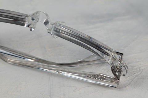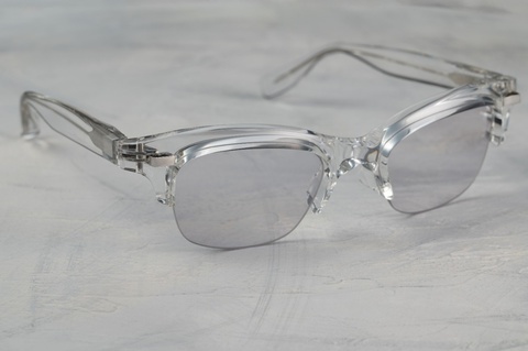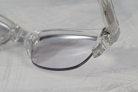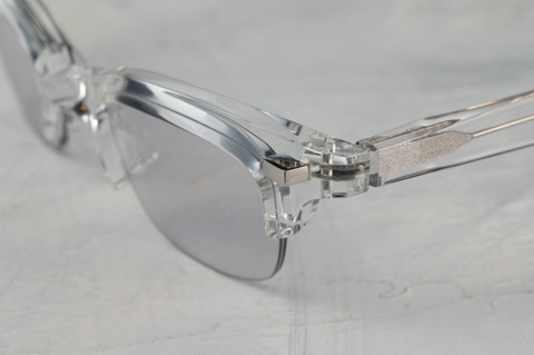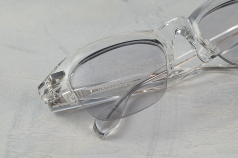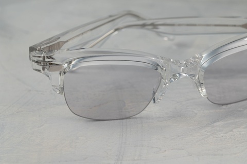 もともとは重厚感のあるレトロシリーズのブローフレームですが、クリアカラーということもあり、見た目のボリュームが軽減され、これからの季節にピッタリの涼しげな印象を作り出します。今日は、ここ最近多様している濃度28%のカラーレンズを組み合わせ、サングラス仕様としてご紹介をさせていただきます。