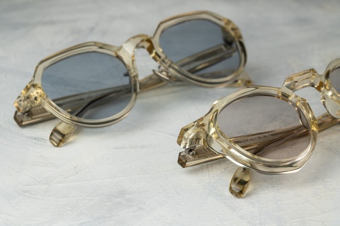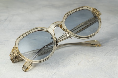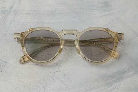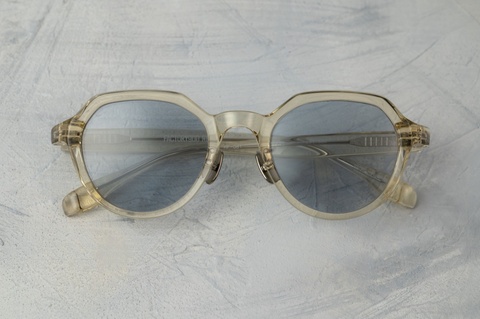 こちらも過去のブログでご紹介した、特殊カラーレンズ”キャリアカラー”を組み合わせたサングラス。同じ「col.880」キハクですが、両モデルの対照的な造形によって、それぞれ受ける印象はまたベツモノですね。