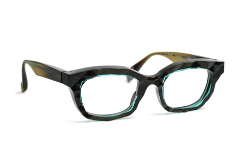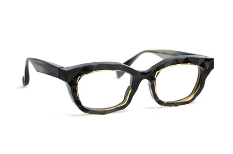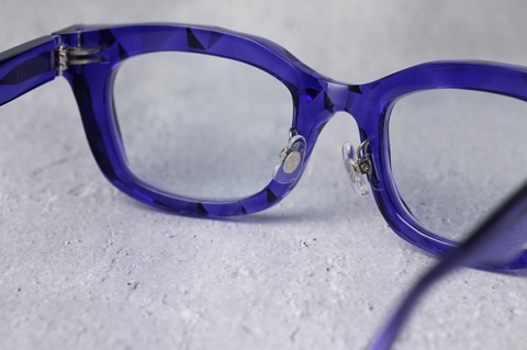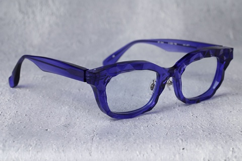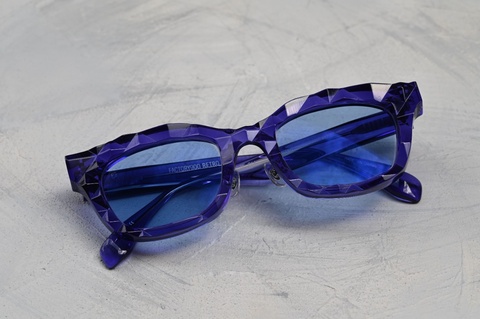 ご存じ「RF-064」は、表面に施されたダイヤモンドカットが大きな特徴であり、光の当たり方や見る角度によってフロント表面の表情が変化し、アセテートの美しさが際立ちます。本来、ダイヤモンドカット面が1番際立つのは「col.001」(黒)になりますが、透け感のあるcol.417(バイオレット)も、不規則な光の反射によって妖艶な輝きを放ちます。