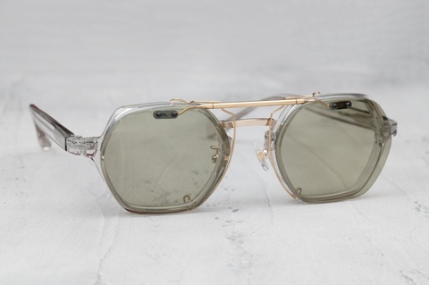 先日あるお客様に、「RF-057」col.582(グリーン)をお求めいただいた際に、ガンメタル×スモークの組み合わせでクリップオンサングラスをご提案させていただきました。直営店では「RF-057」にクリップオンサングラスの組み合わせは初となりますが、その仕上がりが非常にカッコよく、店頭用のサンプルとして、「col.049」にシャンパンゴールドの組み合わせをご用意してみました。