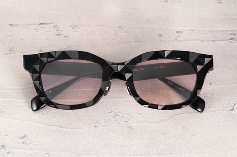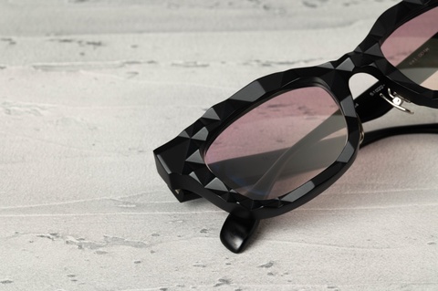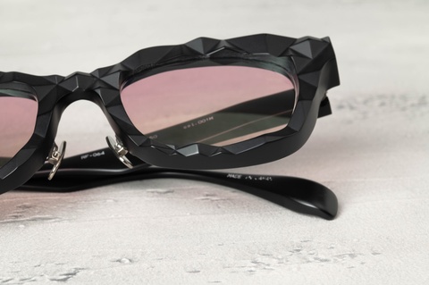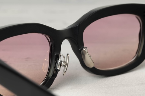 こちらは、先日あるお客様よりご注文をいただいた「RF-064」マットブラックですが、今回はカラーレンズを組み合わせていただきました。レンズは、パープルとピンクのダブルグラデーションカラーを見本染色にて、さらにシルバーミラーコートを組み合わせた特別仕様となっています。