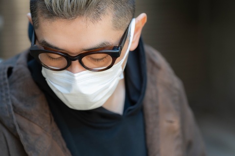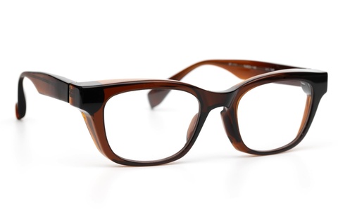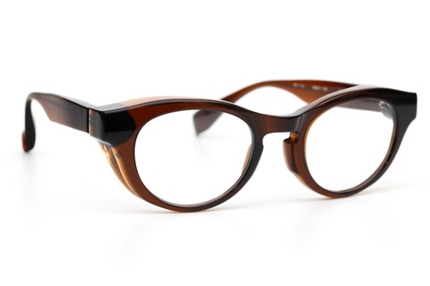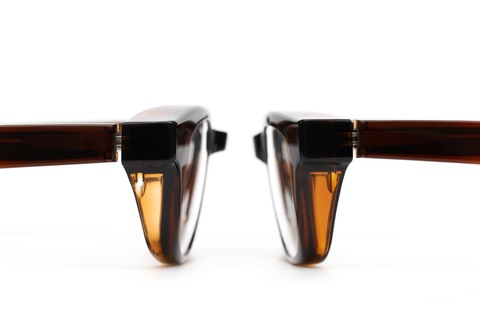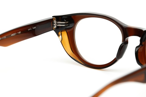 また、ご覧のようにフード状のリムはお顔に対して程度に密着し、これから春に向けて花粉除けとしても効果が期待できます。なにより、アセテートでこの形状をカタチにすることが驚きですが、普段使いのメガネとして恥ずかしくないそのクオリティーの高さは、FACTORY900ならではといえるのではないでしょうか。