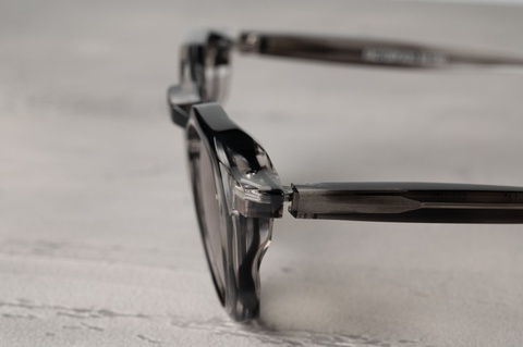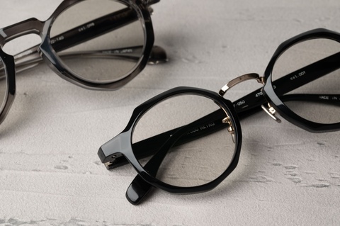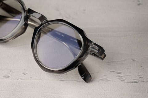 ご覧のようにフロントの上下でも厚みの強弱がつけられており、一見シンプルな作りに見えますが実はかなり手の込んだモデルといえます。これによりフレームに立体感が生まれ、お顔に合わせた際にも平面的な印象にならず、豊かな表情を印象付けます。