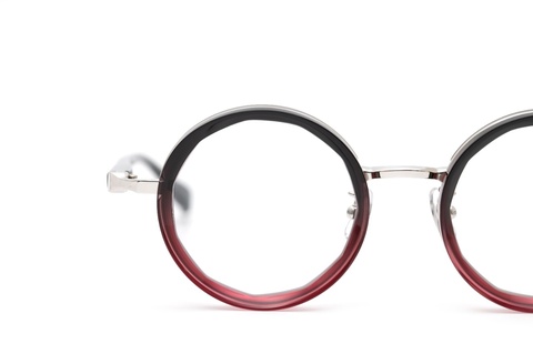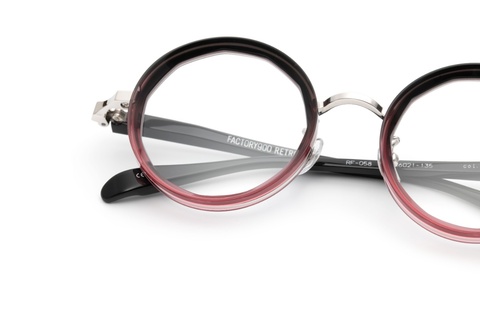 ご覧のように、レトロシリーズの人気モデル「RF-051」と同じくラウンド型の「RF-058」ですが、その正体は11角形でカタチづくられたアセテートを組み合わたコンビネーションフレームになります。同じ「RF-050番台」の八角形「RF-055」は、見た目の通り特徴的な玉型ではありますが、「RF-051」をベースにデザインされた「RF-058」は、よりシンプルなラウンド型にほど良いアクセントを与えてくれます。
