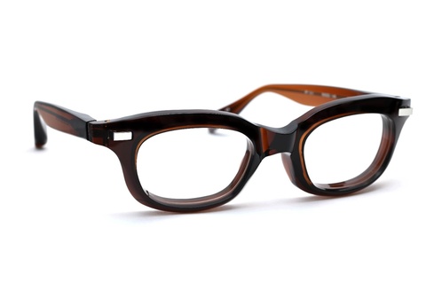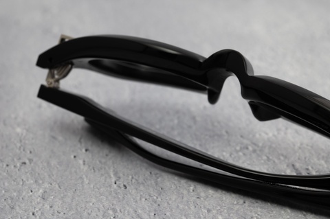 「RF-040」から受け継いだ、肉厚なフォルムに全体的に重量感のある佇まい、そして曲線を描いたフロントに埋め込まれた直線的な”飾り鋲”が見た目のボリュームに1点のアクセントを宿します。FACTORY900(大文字シリーズ)シリーズを彷彿とさせる、どこまでも拘り抜いた立体的なフロントの面造形は、一般的なクラシックフレームとは一線を画す、FACTORY900 RETROならではのデザインです。