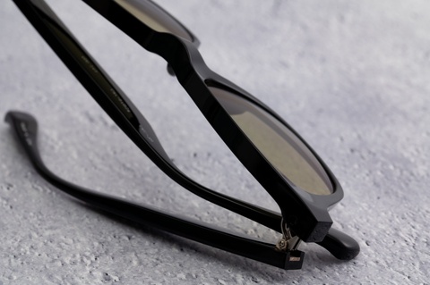 このように斜めからご覧いただくと、フロントにテレビジョンカットが施されていることで、見た目のボリュームを感じさせずスマートな印象に。どうしても武骨なイメージが先行するレトロシリーズですが、カラーレンズとの組み合わせにより、さらにクールで都会的なイメージを作り上げます。