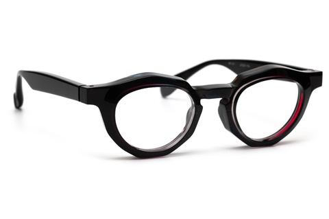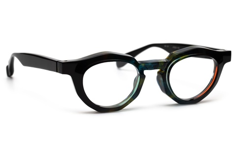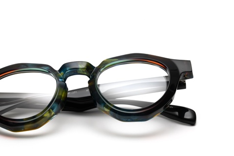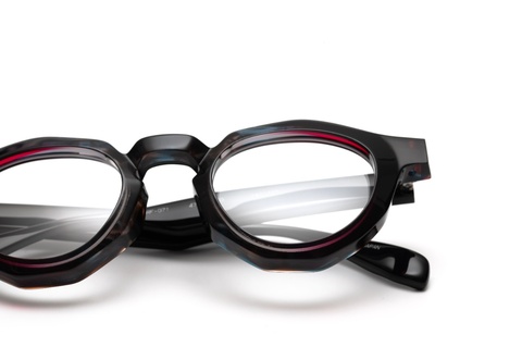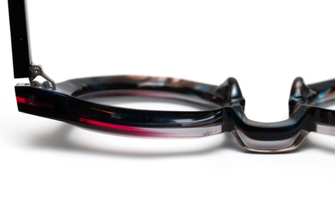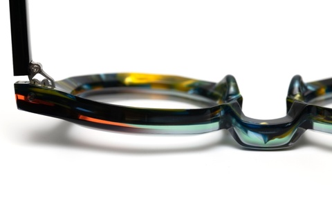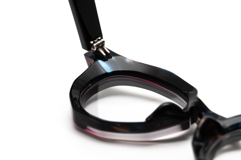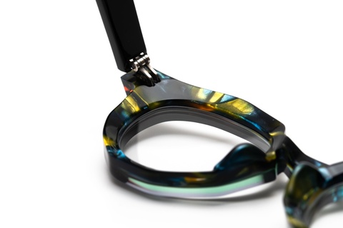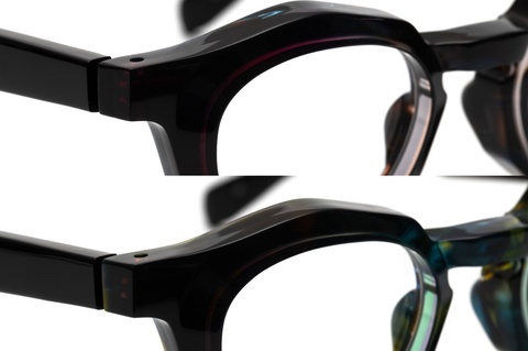 「RF-071」のカラーバリエーションには、クラシカルなイメージを一新する、バラフ(べっこう柄)とイエローを上下に組み合わせたツートンカラー「col.667」が存在しますが、そのインパクトと新しさの反面、掛けこなしのハードルも高くなります。そこで、今回はオリジナリティの出しやすいツートンカラーではなく、2枚の異なる生地を前後に張り合わせ、そこから厚みを調整する、非常に贅沢な仕様となっています。