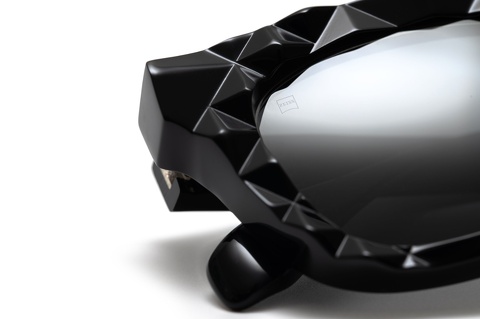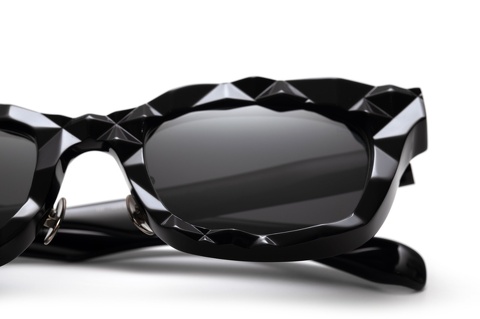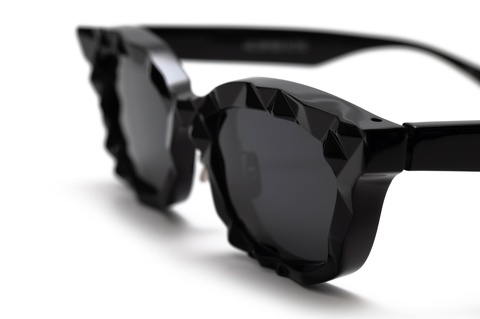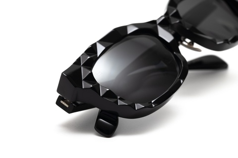 もともとフロントのシェイプは合わせやすいウェリントン型ということもあり、遠目では一見オーソドックスなサングラスに見えますが、表面にランダムに配置されたダイヤモンドパターンが光の反射、そして見る角度によって様々な表情を作り出し、オリジナリティ溢れるサングラスに仕上がったと思います。