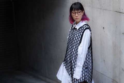 また、どうしてもその先鋭的なデザインから掛けこなしのハードルが高いと思われがちな「RF-140番台」ですが、落ち着いた色合いによってシンプルな装いにも合わせやすく、メガネだけが主張して見えてしまうことを軽減します。この「col.321」(茶ササ)が地味に感じてしまう皆さんには、この後おススメのカラーが登場しますので最後までお付き合いください。