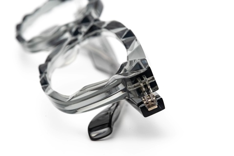 シェイプそのものはオーソドックスなウェリントン型でありながら、フロントの表面に施されたダイヤモンドカットが個性を放つ「RF-064」に対して、肉厚で重厚感のあるフロントが直線的なラインによって際立つ「RF-150」は、シンプルでありながら存在感を放つ「RF-150」